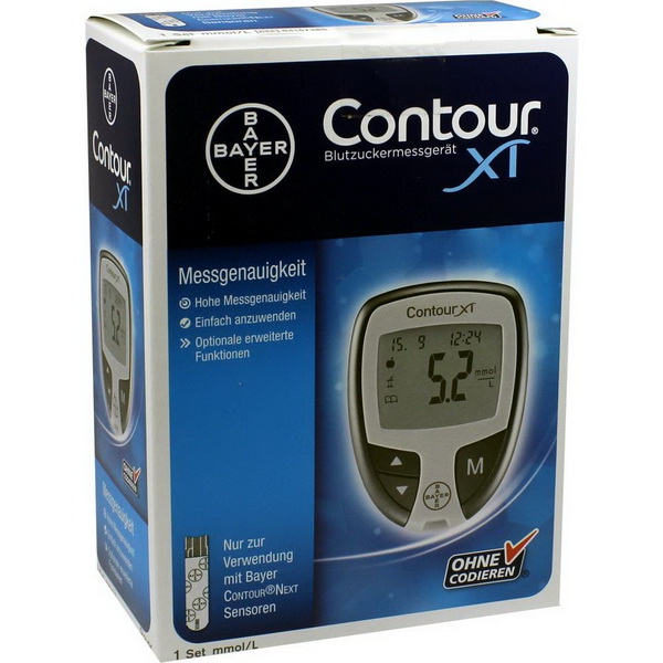 | Lieferumfang Set | • CONTOUR® XT Blutzuckermessgerät • 5 CONTOUR® NEXT Sensoren • Kurzbedienungsanleitung • Bedienungsanleitung • MICROLET®2 Stechhilfe • 5 MICROLET® Lanzetten • Blutzuckertagebuch • Etui |