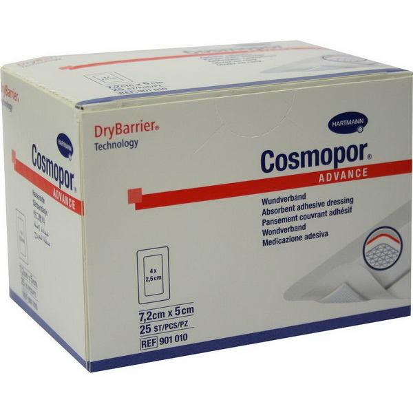 Cosmopor® Advance sind mit der innovativen DryBarrier® Technologie ausgestattet, die ermöglicht, dass das Wundexsudat in das Wundkissen aufgenommen, aber nicht wieder abgegeben wird – selbst unter Druck. Diese Kombination von hoher Saugkapazität und geringster Rücknässung erlaubt, dass der Post-OP-Verband länger auf der Wunde verweilen kann. Bei dem Produkt handelt es sich um einen sterilen selbstklebenden Wundverband aus weichem Trägervlies, ausgestattet mit einem hoch absorbierenden Wundkissen