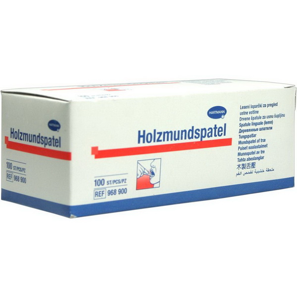 Holzmundspatel, die durch ihre außerordentlich sorgfältige Verarbeitung und die abgerundeten Kanten eine hohe Anwendungssicherheit gewährleisten; steril, einzeln in Blisterpackung sowie unsteril erhältlich.