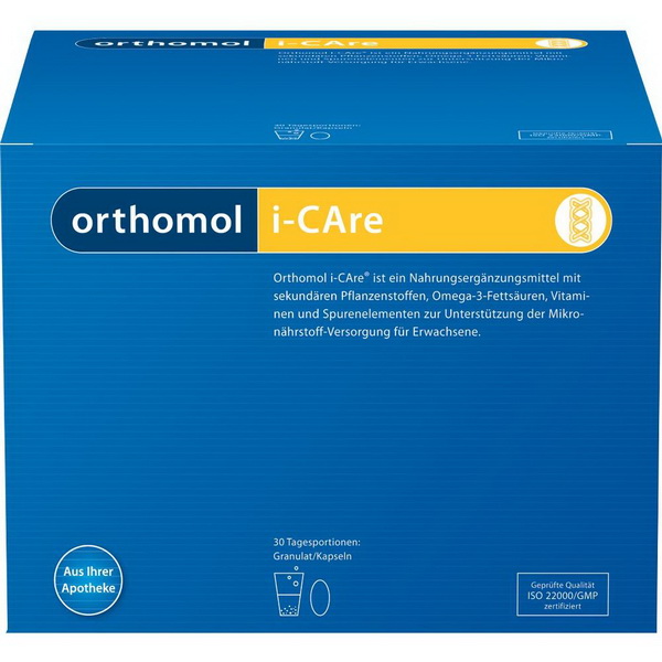 Orthomol i-CAre™ ist ein Nahrungsergänzungsmittel. Mit sekundären Pflanzenstoffen, Omega-3-Fettsäuren, Vitaminen und Spurenelementen.