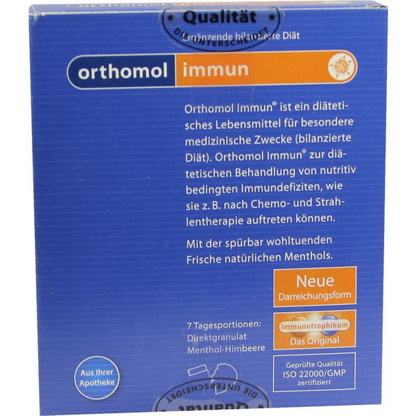 Orthomol Immun™ ist ein diätetisches Lebensmittel für besondere medizinische Zwecke (bilanzierte Diät). Orthomol Immun™ zur diätetischen Behandlung von nutritiv bedingten Immundefiziten, wie sie z. B. nach Chemo- und Strahlentherapie auftreten können.