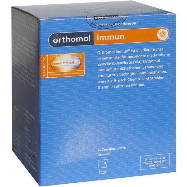 Orthomol Immun™ ist ein diätetisches Lebensmittel für besondere medizinische Zwecke (bilanzierte Diät). Orthomol Immun™ zur diätetischen Behandlung von nutritiv bedingten Immundefiziten, wie sie z. B. nach Chemo- und Strahlentherapie auftreten können.